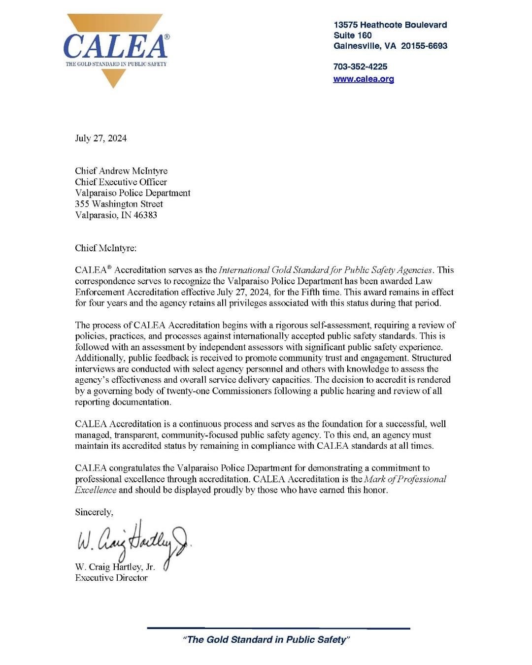 In August of 2010 the Valparaiso Police Department completed a goal established four years earlier and was awarded accreditation through the Commission of Accreditation for Law Enforcement Agencies (CALEA). The Valparaiso Police Department became the 13th police agency to receive a CALEA accreditation in Indiana and just over 500 nationally.