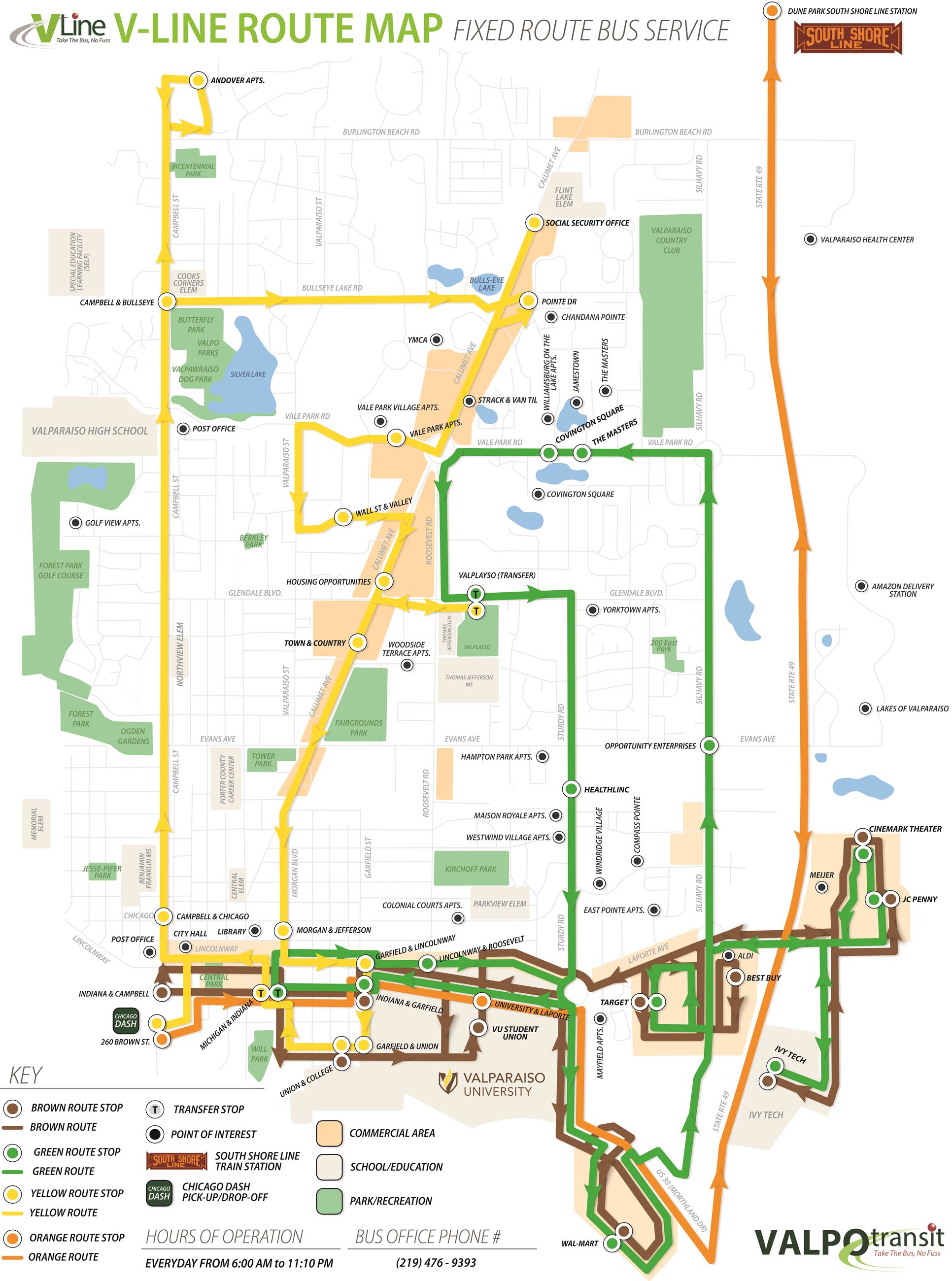To meet the varied demands of our community, the City of Valparaiso has developed three specific services of the V-Line transit: the Green, Yellow, and Brown lines. Alternative formats are available upon request.